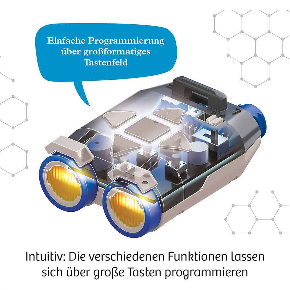 Ab 10 Jahre. Inhalt: Bauteile des Roboters. Vorprogrammierte Platine. 2 Motoren und Getriebeteile. Farbig illustrierte Anleitung. Betrieb: 4 x 1,5-Volt-Batterien Typ LR03 AAA, Micro (nicht enthalten).