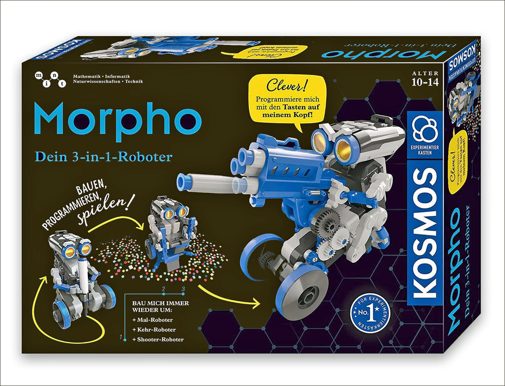 Der MORPHO 3-in-1-Roboter von KOSMOS bietet Kindern einen einzigartigen und praxisnahen Einstieg in die faszinierende Welt der Robotik. Aus mehreren Modulen entsteht ein wandelbarer Roboter, der nicht nur malt, sondern auch Krümel beseitigt und Soft-Darts abfeuert. Über ein leicht verständliches Tastaturfeld steuern kleine Forscher MORPHO ganz ohne App. Dabei lernen sie, Funktionen Schritt für Schritt selbst zu programmieren und eigene Ideen auszuprobieren.