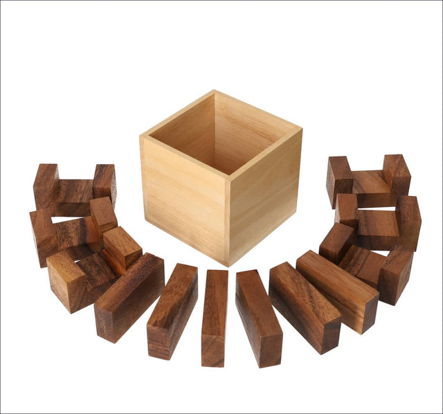 Solo-Denkspiel aus Holz. 12 Holzteile, Kantenlänge Würfel 7,5 x 7,5 cm.
