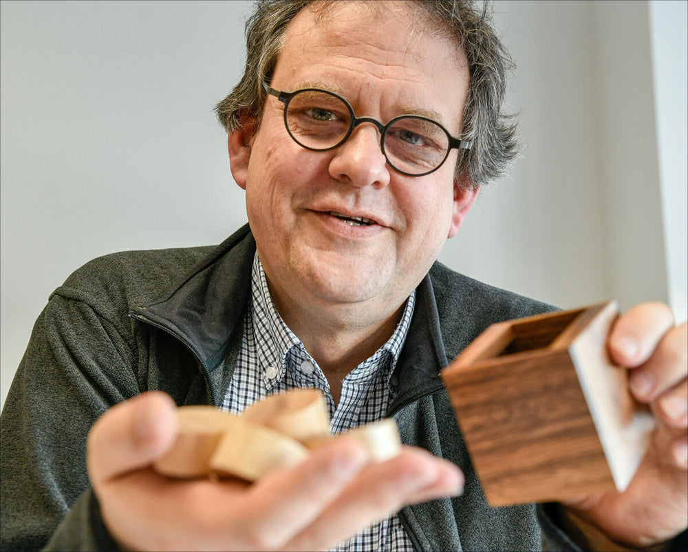 „Gute Lösungen gehen oft gegen die Intuition“, sagt der Physiker (Uni Würzburg) und preisgekrönte Puzzle-Erfinder Dr. Volker Latussek. Hier ist sein schwierigstes Denkspiel: Bei Harun müssen Sie nur 12 Holzteile zurück in die Box legen. Es darf also am Ende nichts über den Rand stehen - ein Kinderspiel? Von wegen!